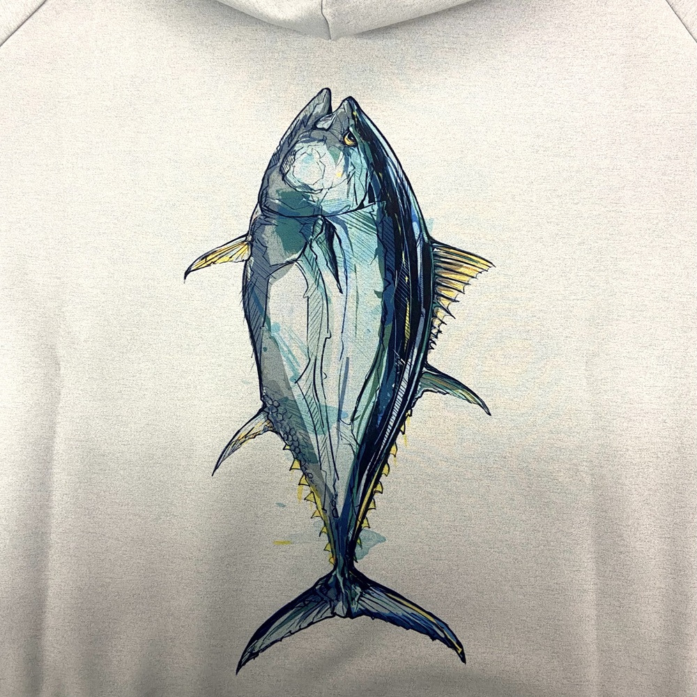 Bellissima felpa Bkk di colore grigio con disegno del tonno nella schiena. Ideale per andare a pescare ma anche per una passeggiata outdoor. Fantastica idea regalo.