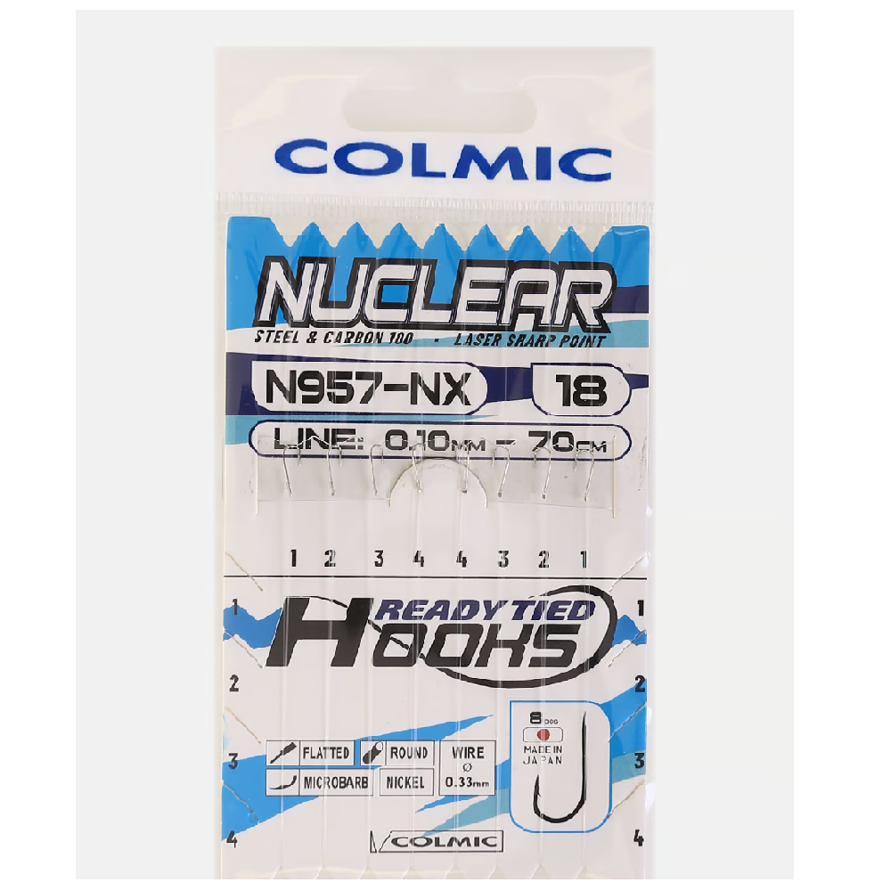 I terminali Colmic Nuclear N957‑NX rappresentano un punto di riferimento per la pesca al colpo e la pesca match, pensati per affrontare pesci particolarmente sospettosi o in acque molto battute. Ogni confezione contiene 8 ami fabbricati in Giappone, realizzati con acciaio al carbonio di alta qualità, rivestiti nichelati (versione “NX”).
