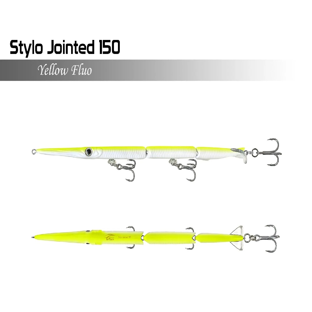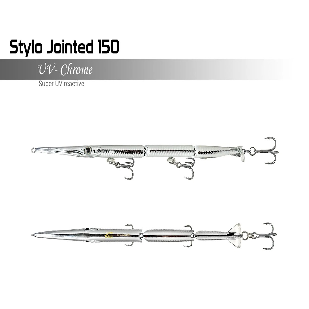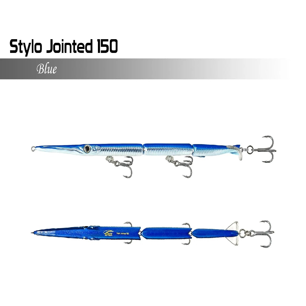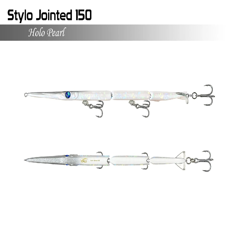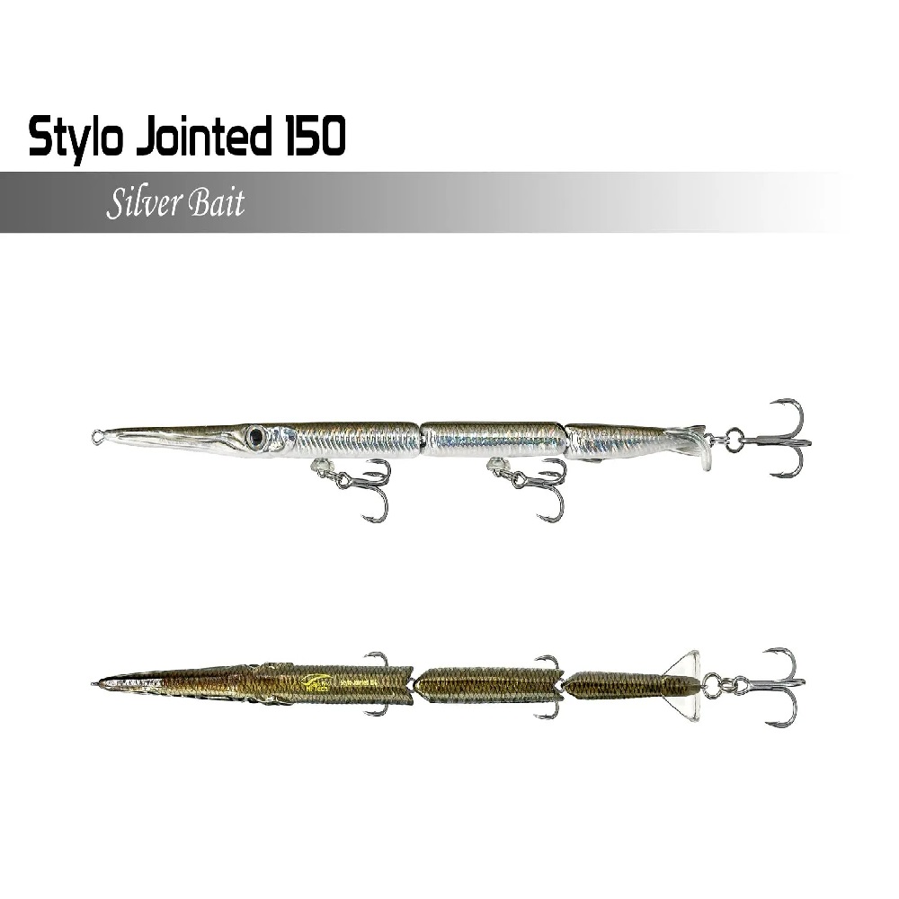 Stylo Jointed 150 di Jackfin è un artificiale a 3 sezioni che imita alla perfezione il nuoto di un’aguglia. L’aguglia è la preda più comune per Barracuda, pesci serra, Lecce, Spigole e specie pelagiche come Lampughe, Alletterati o Ricciole.